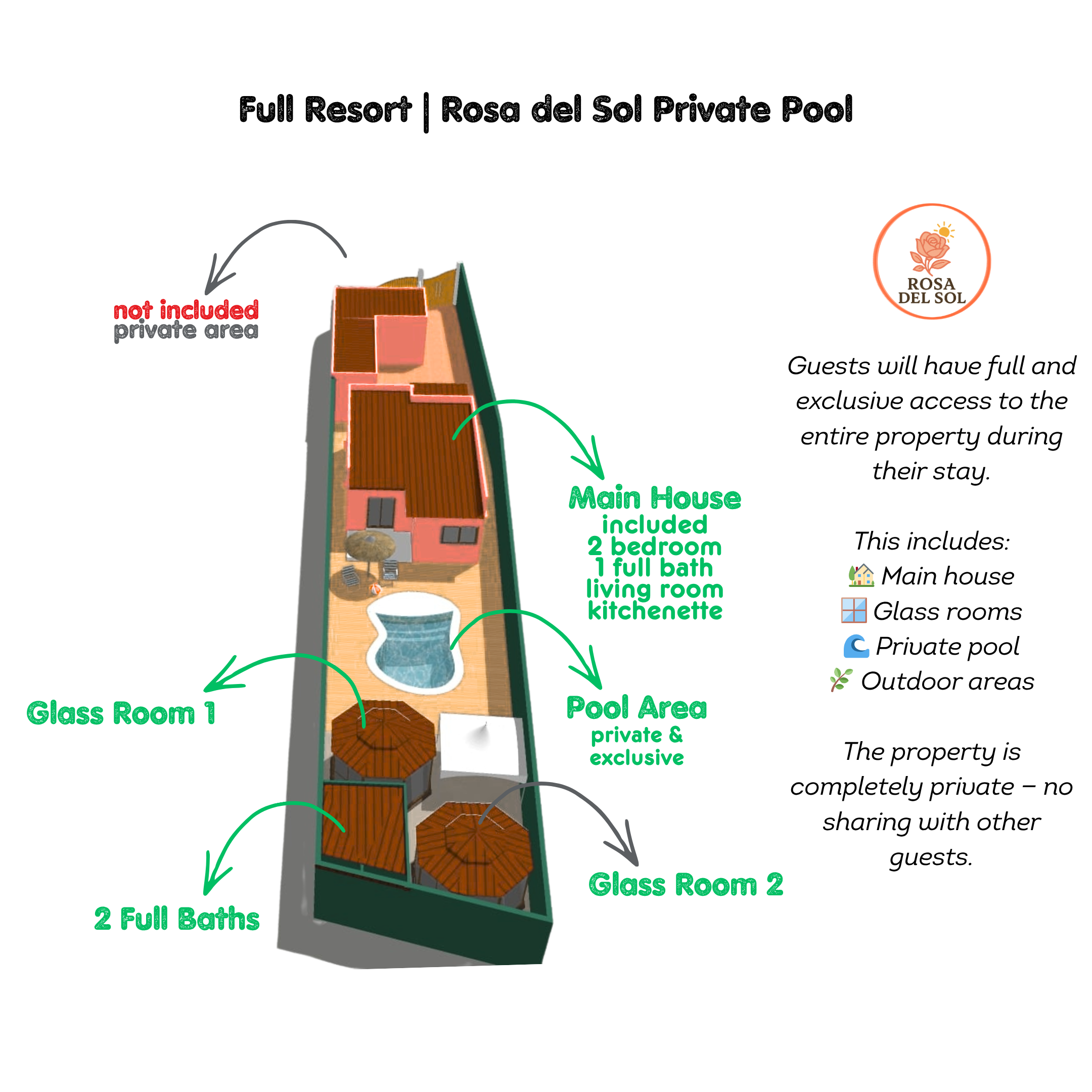You’ll have full and exclusive access to the entire property, including: 🌸 Main house 🌸 2 Glass Rooms 🌸 Private pool 🌸 All outdoor lounge and dining areas 🌸 Additional outdoor bathrooms ✔️ The entire property is private — no other guests during your stay. Caretakers may be on-site if needed, but your space remains fully yours.